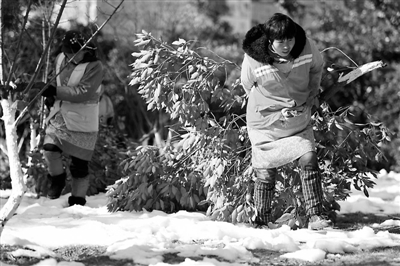 近日,合肥市持续的大雪将很多城市绿化树木压折,给市民出行带来不便。为了及时清除折断的树枝,绿化工人早晨六点多便开始收集、装运折断的树枝,累了困了就席地而卧小憩片刻。绿化工人说:“我们这几天抓紧清理,减少给市民出行带来的不便,辛苦点也值得。” 新华社记者 刘军喜 摄