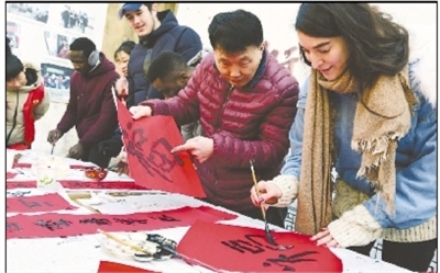 1月14日,在江苏省镇江市金山街道杨家门社区,外国留学生在学写福字。