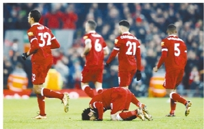 1月14日,利物浦队球员萨拉赫(下)进球后亲吻草坪。
