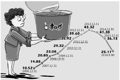 方便面巨头康师傅公司的年报显示,2006年至2013年,康师傅方便面板块营收从10.52亿美元增长至43.32亿美元。2013年至2016年,这一板块营收下降至32.39亿美元,与2013年相比跌幅高达25.24%。