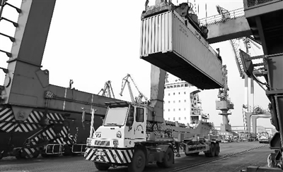 1月17日,唐山港京唐港区的工人操作门吊将装有进口汽车的集装箱卸下船。