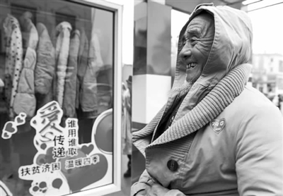 1月18日,一位退休工人在爱心驿站试穿棉衣。