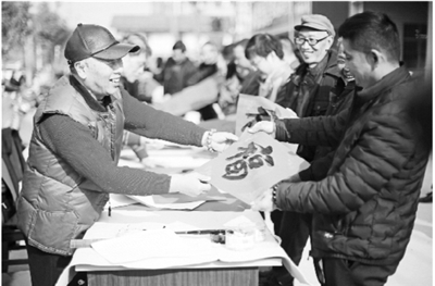 1月17日,书法爱好者为赣州经济技术开发区章良村群众书写并赠送“福”字。