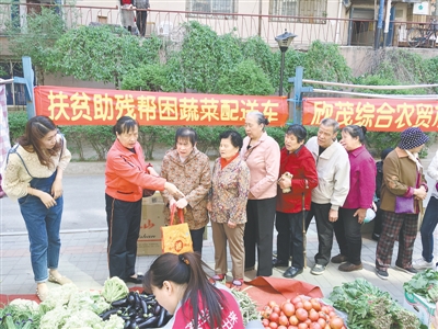 以前,盲人要托子女、志愿者或者半盲的人从菜场里带回一周的菜;2017年5月开始,每个周四,社区都会请附近农贸市场的工作人员为盲人送菜。