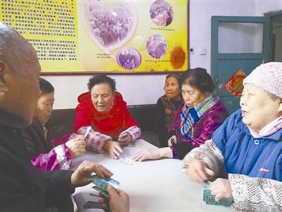 佟德路(左一)、曹丽文(右二)等人在活动室打扑克 。