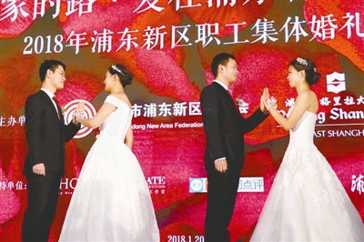 当日,由上海市浦东新区总工会等单位发起的职工集体婚礼在浦东香格里拉大酒店举行。来自浦东新区各行各业的22对职工新人喜结良缘,共迎人生最幸福的时刻。这些职工新人都至少有一方是外来建设者,他们参加集体婚礼免除了所有花费,并获赠回家过年的路费。