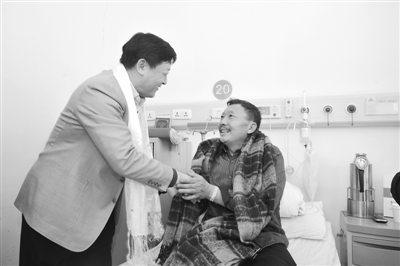 2018年1月11日中午,北京佑安医院的外科病房里弥漫着浓浓的暖意和爱心,三位藏族患者眼含热泪,激动地把一条条哈达送给他们心目中的每一个好心人并送上了真挚的祝福“扎西德勒”。藏族包虫病患者56岁的达娃大叔、55岁的索朗大叔和患有大隐静脉曲张的70岁的白玛卡卓大妈是“同心·共铸中国心”公益救助活动的受益者。