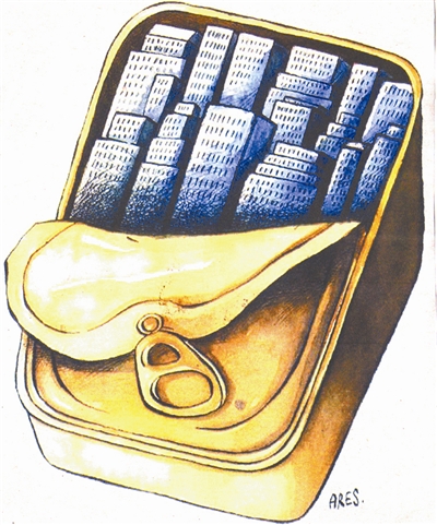 如今城市建筑已超出环境所容纳的空间。由此,漫画家想到了沙丁鱼罐头的包装,这个比喻恰如其分地表现出了问题的实质。【古巴】阿瑞斯