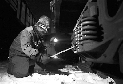 吉林车辆段列检职工克服冬季长时间室外作业的艰辛,强化关键时段车辆技术检查,严格落实作业标准不走样,确保车辆运行品质。图为该段棋盘综合运用车间检车员在午夜时分认真检查车辆枕簧状态。刘浩 孙红玉 摄