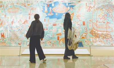 1月16日,系统展示张大千一生创作历程的“张大千艺术展”在中国国家博物馆展出。此次展览的100 余件展品分“集古得新”“临摹敦煌”“大风堂收藏”“大千师友”“大千用印”五个单元。张大千生前在敦煌的临摹壁画也首次全景展出,一幅幅精美的作品再现了这位20世纪国画大家一生各阶段的重要创作。主办方表示,希望通过此次展览,可以让观众对张大千的艺术道路有更为全面的认识,进而了解他对20世纪中国艺术的贡献。该展览将一直持续至3月4日。图为观众正在欣赏张大千在敦煌莫高窟的临摹作品——《临摹晚唐劳度叉斗圣变图轴》,该图讲述了外道劳度叉与佛弟子舍利弗斗法的故事。