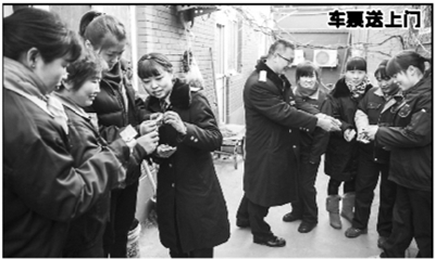 1月19日,北京市大兴区本草方源药业公司职工收到北京西站送来的火车票。北京西站开通了务工人员购票专口,已为42家企业办理团体票2000余张。本报记者 王伟伟 摄
