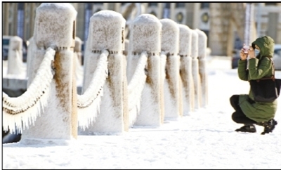 1月24日,一名游客在山东省烟台市滨海广场拍摄海岸栏杆上的冰凌。