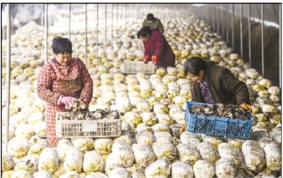1月24日,河北省武强县农发家庭农场的工人在大棚内采摘蘑菇。