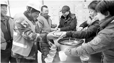 “腊八”前后,秦皇岛市海港区玉峰南里社区居委会、工会联合会开展了“腊八粥 送温暖”活动。社区工作人员将一碗碗热气腾腾的腊八粥送给辖区建筑工地上的农民工,让农民工们感受到温暖的关怀和传统节日的祝福。