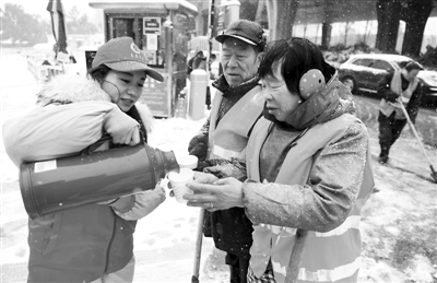 1月25日,金寨南路社区志愿者为环卫工送上热姜汤。