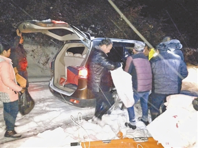 1月26日晚,救援突击队成员抬担架将突发急病的村民王玉娥送到救援车上(手机拍摄)。