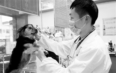 1月24日,南昌犬只领养窗口的工作人员对被领养的犬只进行体检。