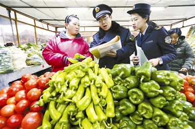 1月28日,山东青岛市即墨区食品药品监督管理局工作人员在一家农贸市场对蔬菜进行检查。