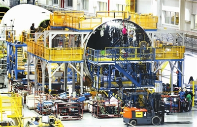 1月26日,在位于美国南卡罗莱纳州北查尔斯顿的波音南卡罗莱纳工厂,工人在后机身段生产车间工作。