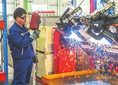 1月30日,在位于河北景县的“龙华现代智能物流装备产业园”,西斯派尔机械配件公司的工人在观察焊接物流装备配件情况。