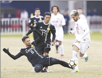 1月30日,天津权健队球员帕托(右)在比赛中拼抢。
