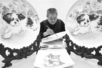 1月31日,河北省邯郸市峰峰矿区一家陶瓷企业的工作人员在制作狗年主题瓷盘。