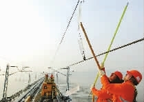 1月30日,南昌供电段的工人们在九景衢铁路鄱阳湖特大桥上对接触网上的覆冰进行清除。