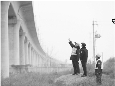 1月27日,山西临汾铁路公安处159号治安岗亭的保安队员王根录(左一)和队友正在值班和巡逻。他们24小时值守,制止侵扰高铁区域损害护网、放牧和烧荒等行为。