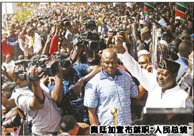 1月30日,在肯尼亚首都内罗毕,拉伊拉·奥廷加(前右一)来到独立花园,宣布就职“人民总统”。当日,在上万名支持者的见证下,肯尼亚前总理、反对派“国家超级联盟”领导人拉伊拉·奥廷加宣布就职“人民总统”,并承诺将“保护并支持肯尼亚的主权、领土完整和尊严”。肯尼亚政府此前曾多次表示,反对派领导人宣誓就职所谓的“人民总统”将被视为“叛国行为”。