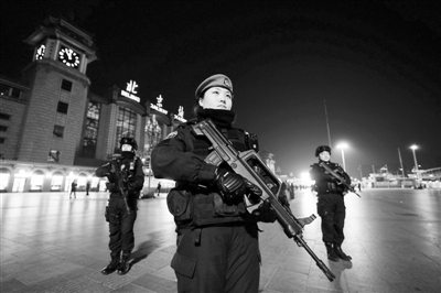 2月1日凌晨,北京铁路公安处铁鹰突击队队员在北京站执勤。