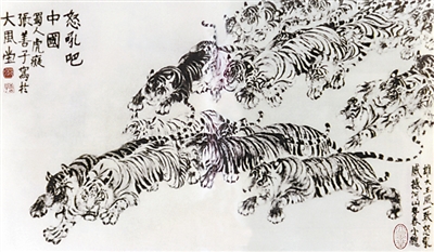 同样亲历重庆大轰炸的“虎痴”张善孖,目睹日军种种暴行,创作《猛虎扑日图》,又名《怒吼吧!中国》,以右上角28只猛虎齐向左下角西落的太阳扑去的气势,展现中华民族团结抗战的决心。
