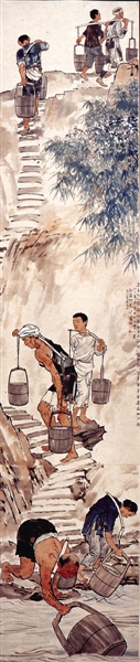 1937年11月,徐悲鸿随中央大学艺术系由南京迁到重庆。在当时江北大石坝家里,他根据重庆汉子江边挑水的场景,以高度洗练手法,将巴人传统汲水的宏大场面分解为舀水、让路、登高前行3个段落,创作出真实记录民众生存景象的艺术珍品,即后来被誉为其最具人民性和抗争精神的代表作——《巴人汲水图》。