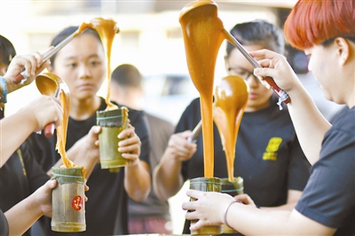 2月4日,在马来西亚首都吉隆坡以北约70公里的新古毛,工作人员把蒸好的年糕盛到竹筒里。