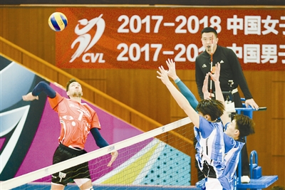 2月4日下午,2017~2018赛季全国男排联赛战至第十七轮,北京汽车男排在主场激战四局,最终以3∶1击败浙江体彩,豪取15连胜,继续高居榜首。北京男排五人得分上双,蒂略斩获19分,王东宸荣获本场比赛最佳球员。图为蒂略(左)在网前扣杀得分。