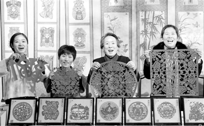2月2日,在河北省黄骅市东常庄剪纸风情艺术小镇,“渤海渔村剪纸”非物质文化遗产代表性传承人韩宝菊(右二)和村民们在一同展示剪纸作品。
