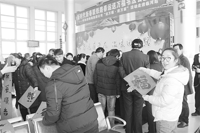 2月6日,中铁呼和浩特局集团公司临河站候车大厅职工书法家们挥毫泼墨,为过往旅客及铁路职工家属免费书写春联和大红“福”字。(付爱民)
