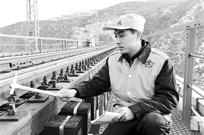 李玉斌每周都要带领工友们对桥上的护轨、螺栓和防爬器,桥梁下部的墩台、梁体与支座等部件进行全方位检修,防止断轨和螺栓折断。