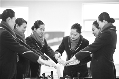 2月7日,在南航海口美兰基地机组航前准备室,任炜(右三)在检查组员仪容仪表。今年27岁的任炜是南方航空公司的一名“90后”乘务长。