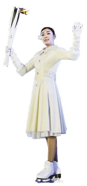 现年27岁的金妍儿在2010年温哥华冬奥会上赢得女子单人滑冠军,2014年索契冬奥会获得亚军后退役。9日晚的开幕式上,她在主火炬塔下的冰面上翩翩起舞,之后从两位朝韩女子联合冰球队队员手中接过火炬,点燃了冰面上的一座冰花,冰花中升出长长的助燃管通向主火炬台,奥林匹克圣火熊熊燃起。