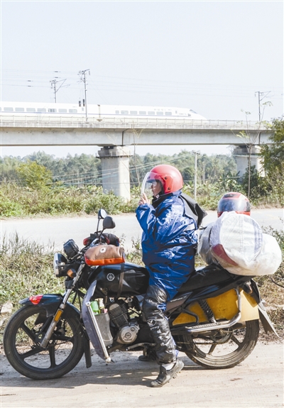 2月3日10时,离开广东佛山20多个小时后,苏文勇清理了一下头盔上的灰尘。他身后的南广高铁(南宁-广州)于2014年开通运营。但春运期间,由于无法提前确定回家的日期,他没有抢到票。