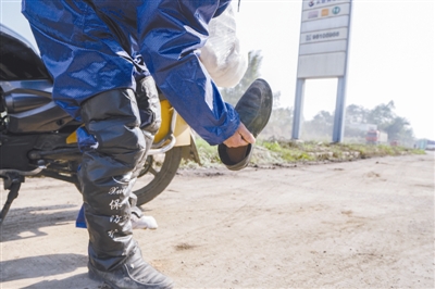 2月3日10时20分,在骑行过程中,苏文勇的鞋里进了一颗石子,他停车将其抖落干净。