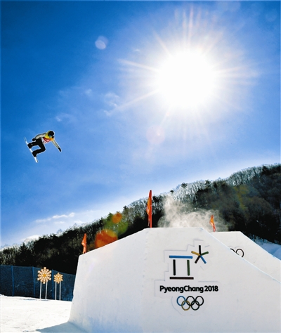 2018年2月12日上午,平昌一夜大雪之后,凤凰雪上公园万里晴空,单板滑雪女子坡面障碍技巧决赛在这里进行。图为18号运动员通过最后一道障碍。