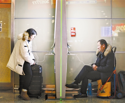 在乌鲁木齐火车站,两名旅客在候车大厅的“充电站”一边充电一边看视频。2018年春运期间,新疆铁路部门在自治区各大火车站设立固定或移动“充电站”,让旅客的体验更美好。张永恒/摄