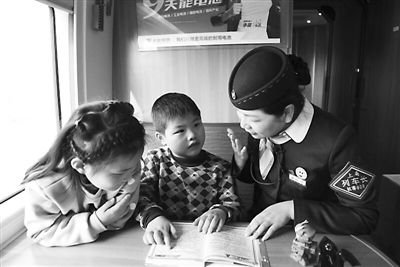 图为2月6日,在宁波开往南宁的G2342列车上,陈怡与小朋友一起读书。