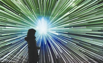 参观者在DT park新媒体艺术展上观看灯光秀(2月12日摄)。