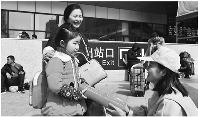 今年春节,福州一些重点工程施工人员放弃节日休假,坚守施工岗位,为建设新福州做贡献。为让他们与家人团聚,福州市总工会和共青团市委邀请务工人员家属来福州过年。图为福州火车站组织志愿者在车站出站口迎接务工人员家属,并为他们送上一份份过年礼物。本报记者 吴铎思 本报通讯员 江曲 摄