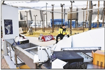 2月14日下午,突如其来的大风将平昌冬奥会江陵冰上运动场外的设施吹得七零八落。