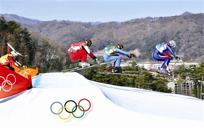 2月21日上午,平昌冬奥会自由式滑雪男子障碍追逐赛在平昌凤凰滑雪竞技场进行,加拿大选手莱曼夺得金牌。图为运动员通过雪山障碍。本报特派记者 许之丰 摄