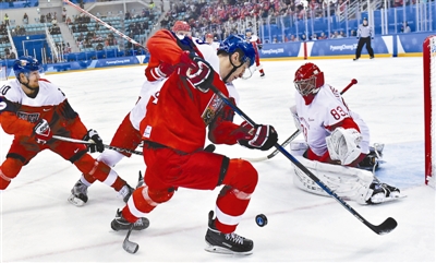 2月23日下午,平昌冬奥会男子冰球半决赛捷克队以0比3负于俄罗斯奥林匹克代表队,后者进入决赛。图为俄奥林匹克代表队门前险象环生。