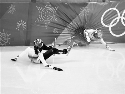 2月22日,韩国选手崔敏静(右)与沈锡希在女子1000米决赛中摔倒。新华社发
